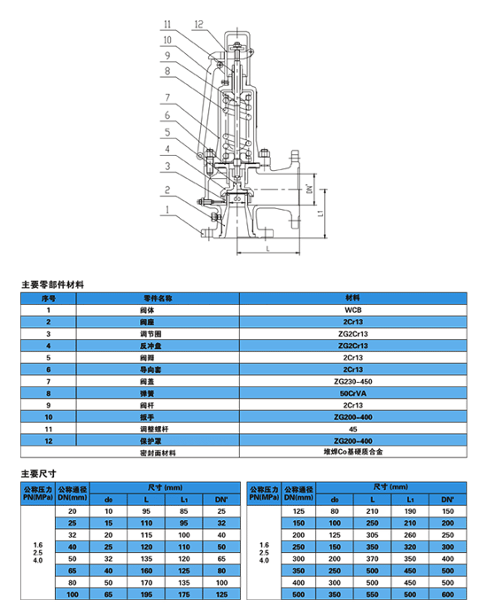 A48Y型彈簧全啟式安全閥適用于工作溫度≤350℃的蒸汽、空氣等介質的設備或管道上,作為超壓保護裝置,當設備或管道內壓力超過允許值時,閥門自動開啟,繼而全量排放,當壓力降至規定值時,閥門自動關閉,保證設備和管道的安全運行。 連接法蘭標準PN<6.4MPa按JB/T-94系列1。PN≥6.4MPa按JB/T-94系列2標準。