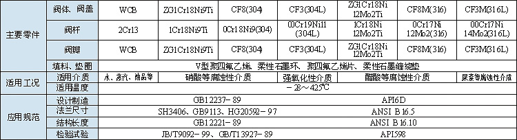 (一)、耐腐蝕性 1、使用介質(zhì)如水、丙酮、酒精、氨、碳酸鋇、苯(WCB材質(zhì)的最低用溫度為-290C,最高溫度為4250C。) 2、使用介質(zhì)如顆粒、油品、紙漿、二氧化碳 氣(不銹鋼材質(zhì)的最低使用溫度為-1000C,最高使用溫度為2320C。) 3、嚴禁使用含氟離子液體(如HF等)也不能用強堿及磷酸(溫度>1500C 濃度>30%)。 (二)、不銹鋼的一般工作溫度:≤1500C (三)、壓力范圍:0.6~2.5MPa (四)、通徑范圍:25~250mm | | |