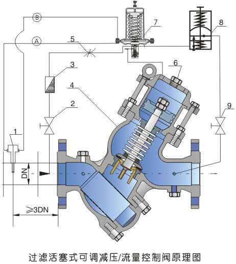 1.畢托管 2.球閥 3.過濾器 4.主閥 5.針閥 6.開度指示器 7.限流導閥 8.減壓導閥 9.球閥 三.主要技術參數和主要零件材料: