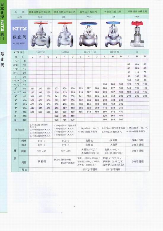 日本北澤KITZ截止閥:截止閥的啟閉件是塞形的閥瓣,密封面呈平面或錐面,閥瓣沿流體的中心線作直線運動。閥桿的運動形式,有升降桿式(閥桿升降,手輪不升降),也有升降旋轉桿式(手輪與閥桿一起旋轉升降,螺母設在閥體上)。截止閥只適用于全開和全關,不允許作調節和節流。