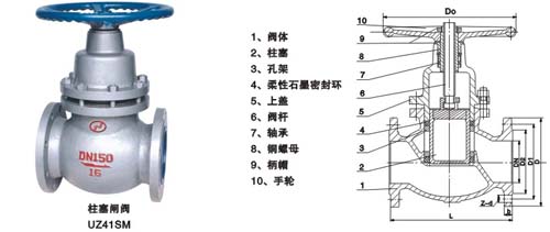 柱塞閘閥(UZ41SM)是由閥體、閥蓋、閥桿、柱塞、導向套、密封環、手輪等零件組成 (如圖)。當手輪旋轉時,通過閥桿帶動柱塞在導向套中上、下往復運動,使柱塞端部斜錐面與閥座面完成閥門的開啟與關閉功能。