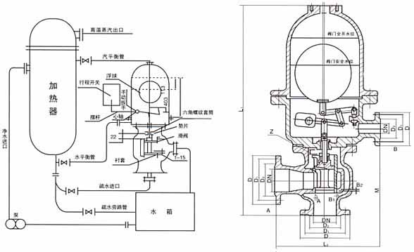 1、利用凝結水液位的變化而使浮球上升和下降,也可以手柄操作,從而驅動下部的啟閉裝置,開啟和關閉,實現排水阻氣的功能。2、該閥隨著凝結水液面上升,當浮球升到距罩蓋底平面403mm時,閥門全開使冷凝結水大量排入水箱。當浮球下降113毫米后,閥門全關,冷凝水不能流出,使浮球穩定的限制在113-403毫米的空間范圍內變化,從而使閥門達到只能排放空氣和水及高溫冷凝水,而阻止蒸汽泄漏的優越性。 3、外形尺寸較大,適用于較大背壓力且不會泄漏蒸汽,排出的凝結水是接近蒸汽壓力的飽和水,故有利于提高本閥門的設備熱效率和二次蒸汽利用的節能特點。