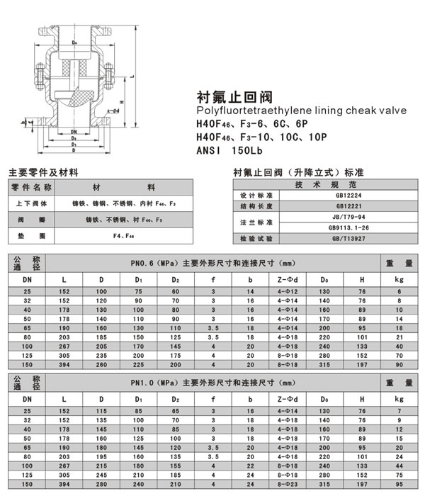H40F46型襯氟止回閥是一種依靠介質本身的流動而自動啟、閉閥瓣用來阻止介質向逆向流動的自動閥門。襯里新型止回閥。FEP(F46)、PCTFE(F3)襯氟止回閥適用在-20℃~150℃的各種濃度的王水、硫酸、鹽酸、氫氟酸和各種有機酸、強酸、強氧化劑,FEP還適用于各種濃度的強堿有機溶劑以及其它腐蝕性氣體、液體介質的管路上使用。 閥。 |